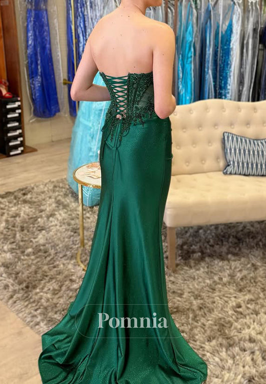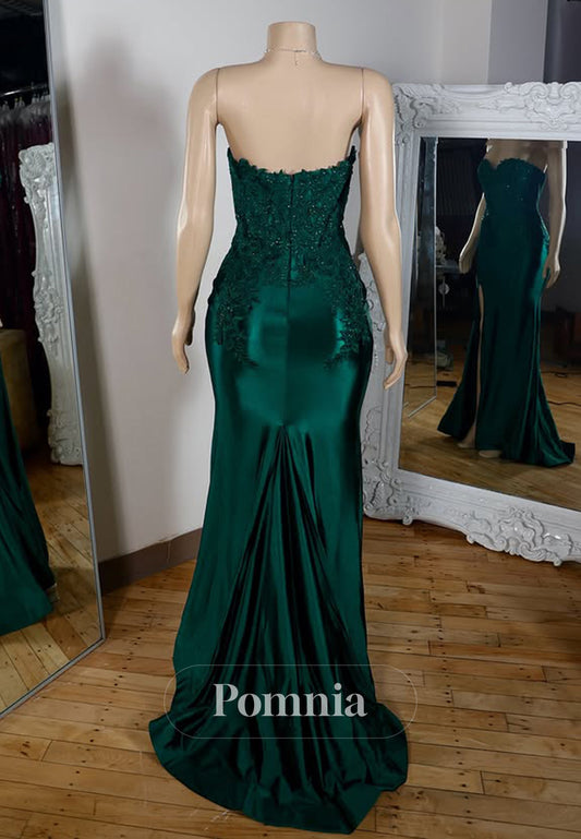 Dark Green Sleeveless Strapless Prom Dress with Slit Appliques Evening Party Dress