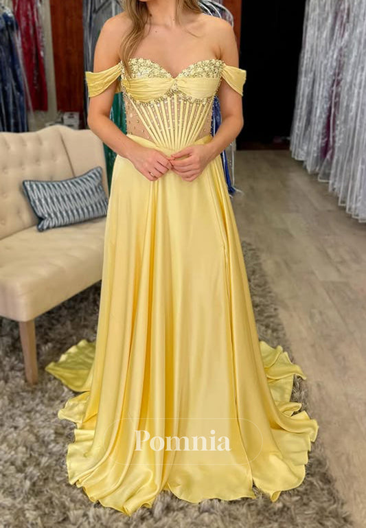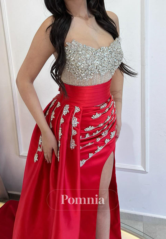P2067 - A-Line Strapless High Slit Beaded Sleeveless Empire-Waist Long Prom Evening Dress