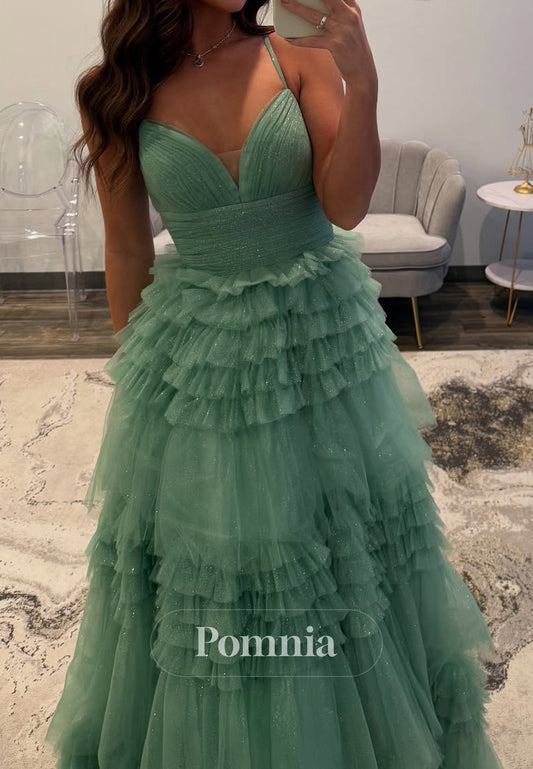 A-Line Spaghetti Straps V-Neck Prom Dress with Ruffles