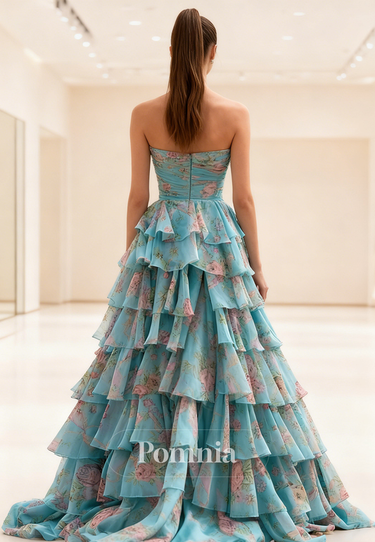 Cute Mermaid Strapless Floral Chiffon Tiered Prom Dress