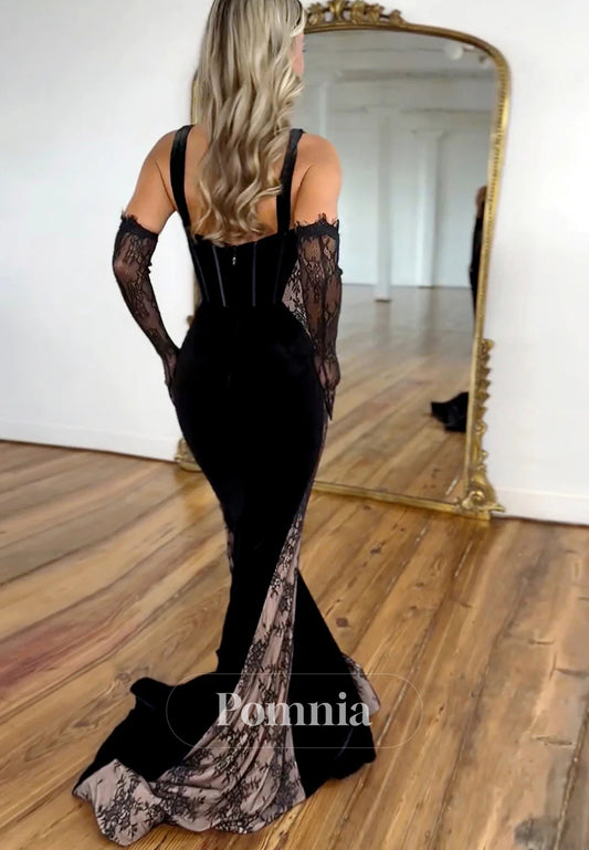 Black Spaghetti Straps Scoop Appliques Velvet Prom Dress
