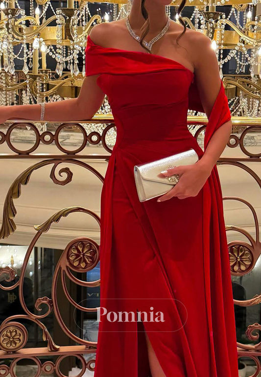 Red One Shoulder Sleeveless Slit Ruched Prom Dress
