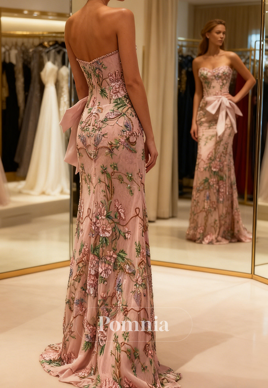 Blush Pink Mermaid Prom Dress with Strapless Lace Bodice and Applique Details
