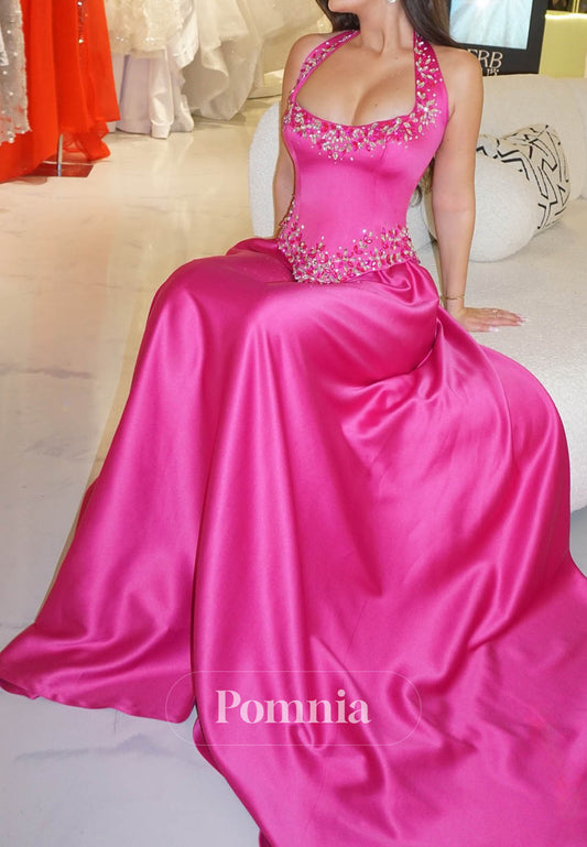 Charming Sleeveless Halter V Neck Long Prom Dress With Pleated
