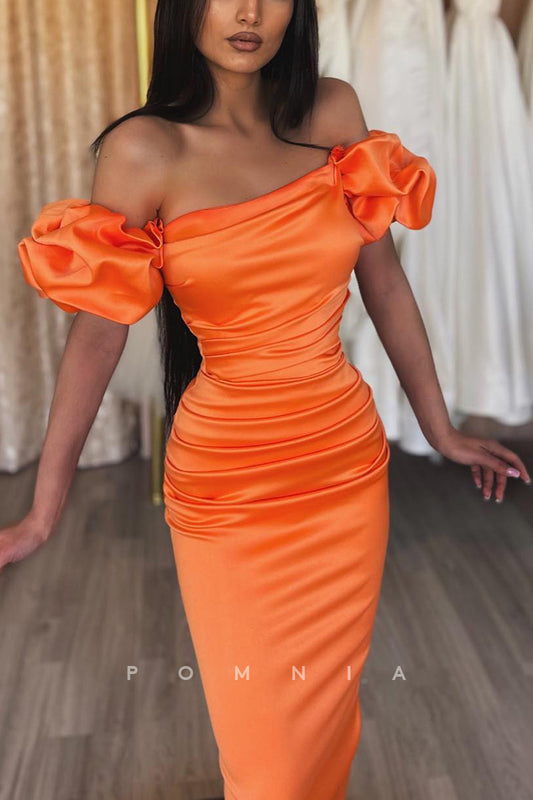 P1174 - Off-Shoulder Pleats Flower Sheath Satin Prom Party Formal Dress