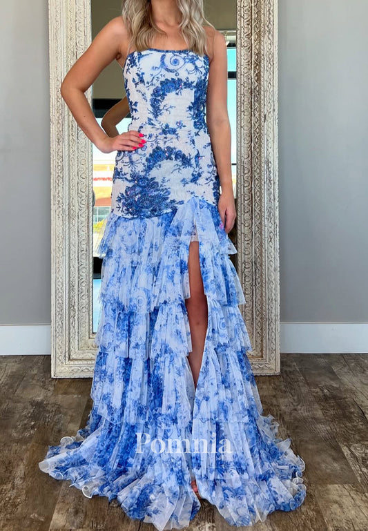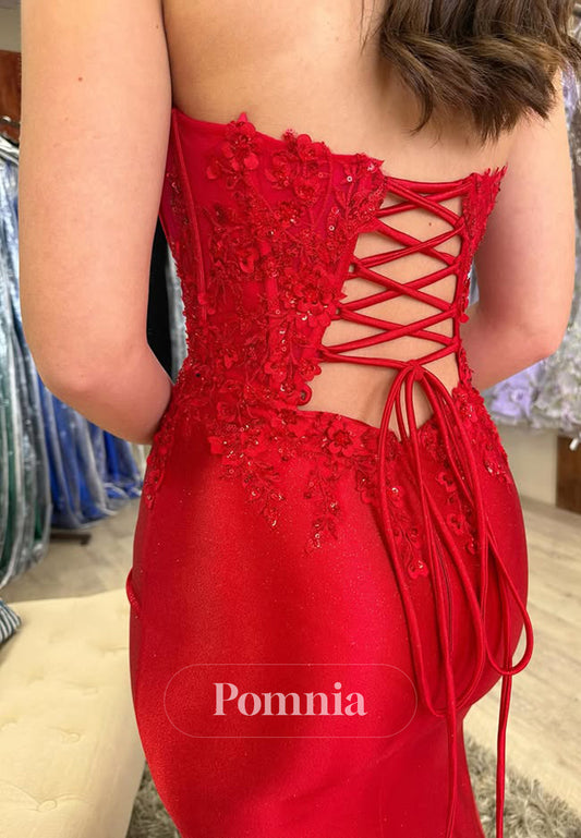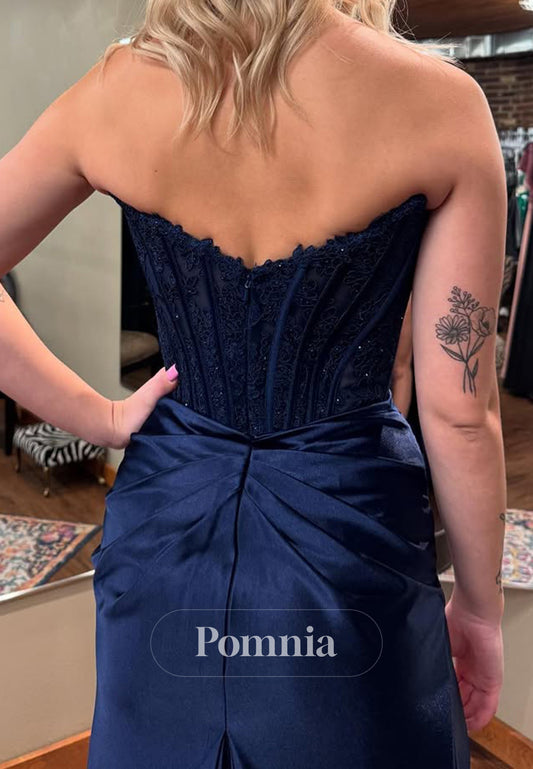 Sexy Strapless Sleeveless Corset Tulle Prom Dress with Slit Appliques Evening Party Dress