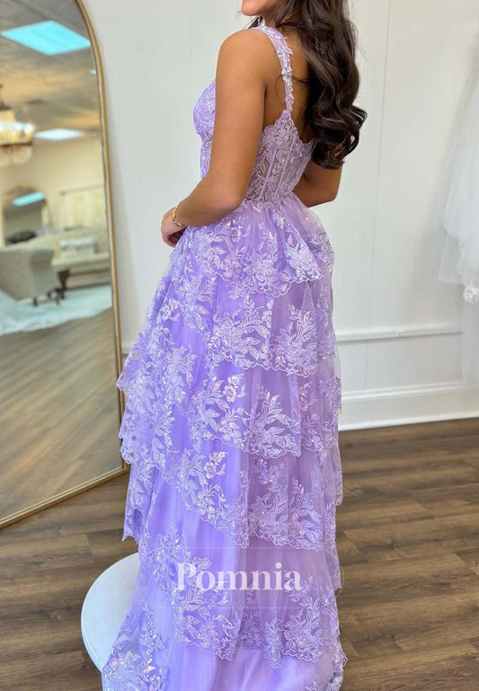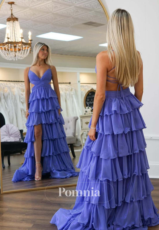 Lilac Spaghetti Straps V-Neck Prom Dress with Slit Ruffles Evening Party Dress