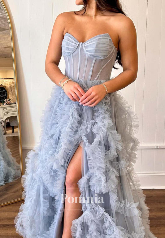 A-Line Strapless Sleeveless Prom Dress with Slit Ruffles Evening Party Dress