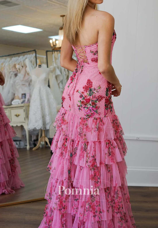 P1572 - A-Line Strapless Sweetheart Side Split Tulle Appliques Prom Formal Dress