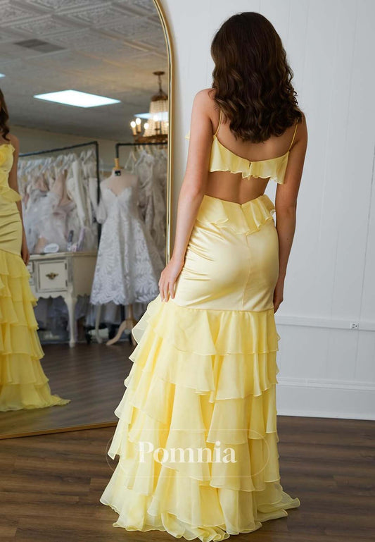 A-Line Spaghetti Straps V-Neck Prom Dress with Ruffles Backless Evening Party Dress