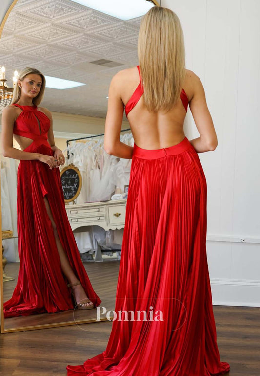 Red Halter Sleeveless Prom Dress with Slit Ruched Evening Dress
