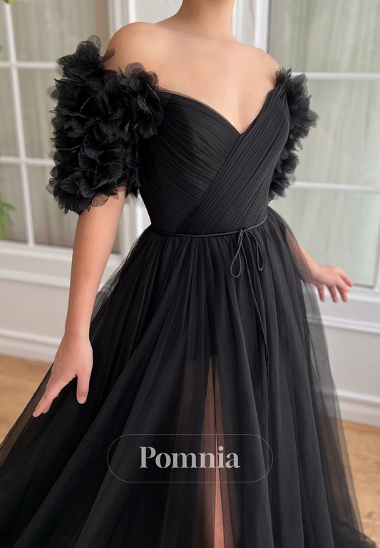 Black A-Line Short Sleeves Prom Dress with Slit Empire-Waist Party Dress