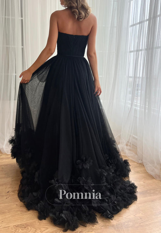 Black Strapless Sleeveless Prom Dress with Slit Pleats Evening Party Dress