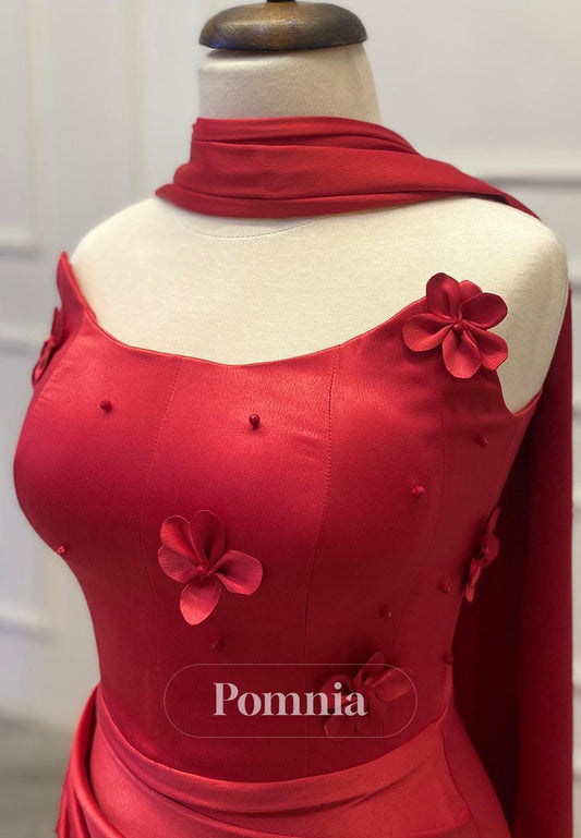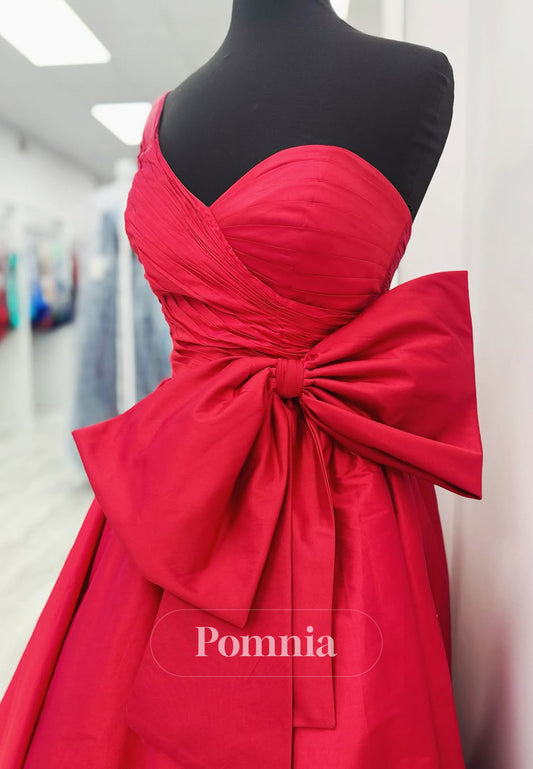 Red One Shoulder Sleeveless Ruched Prom Dress with Bowknot
