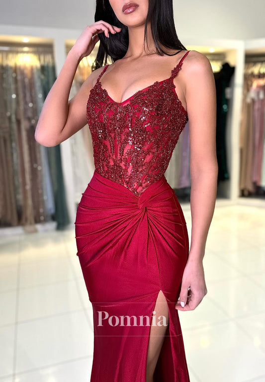 Sheath Spaghetti Straps V-Neck Prom Dress with Slit Ruched Evening Party Dress