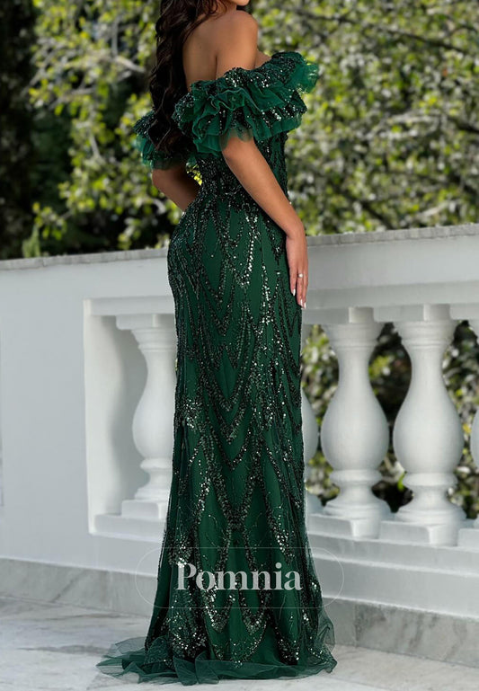 Dark Green Cap Sleeveless Off-Shoulder Sequins Floor-Length Prom Dress