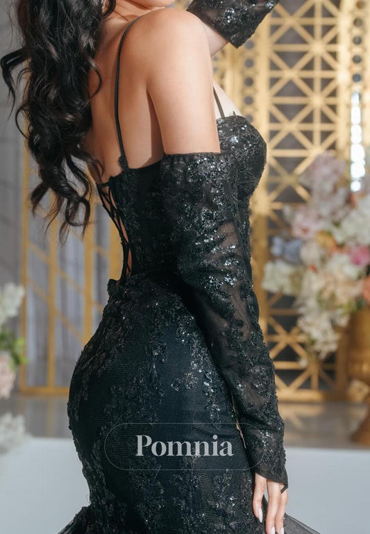 P1834 - Mermaid Lace Long Sleeves Beaded Side Split Long Evening Formal Prom Dress