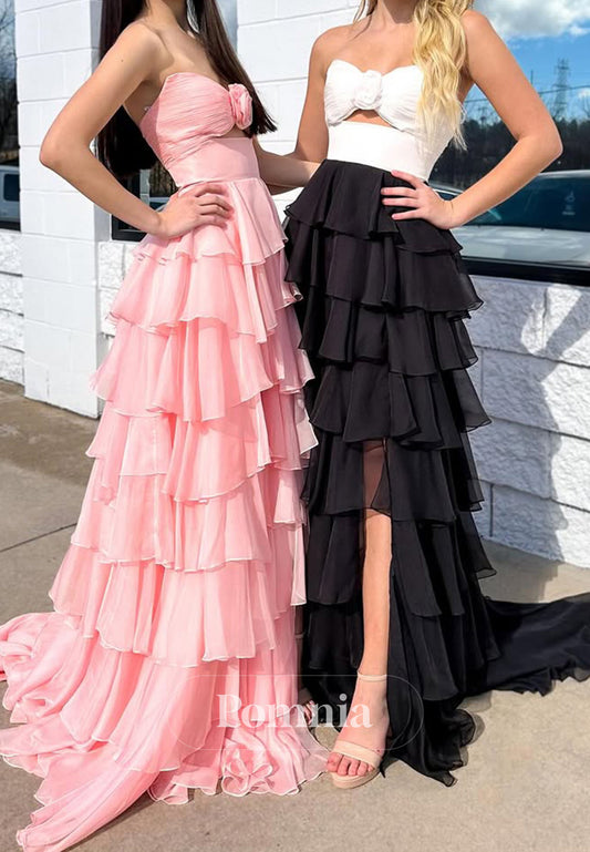 A-Line Sleeveless Strapless Prom Dress with Slit Ruffles Evening Party Dress