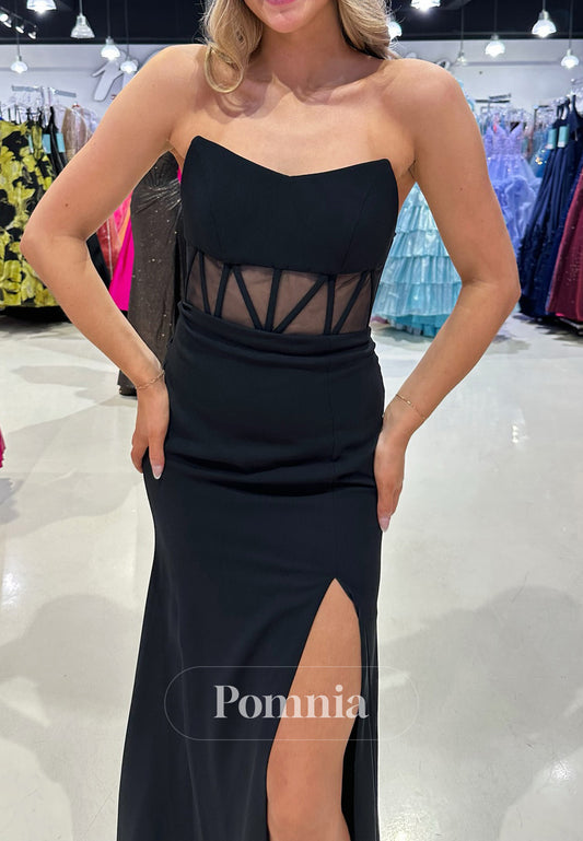 Black Sheath Strapless Sleeveless Prom Dress with Slit Corset Evening Party Dress