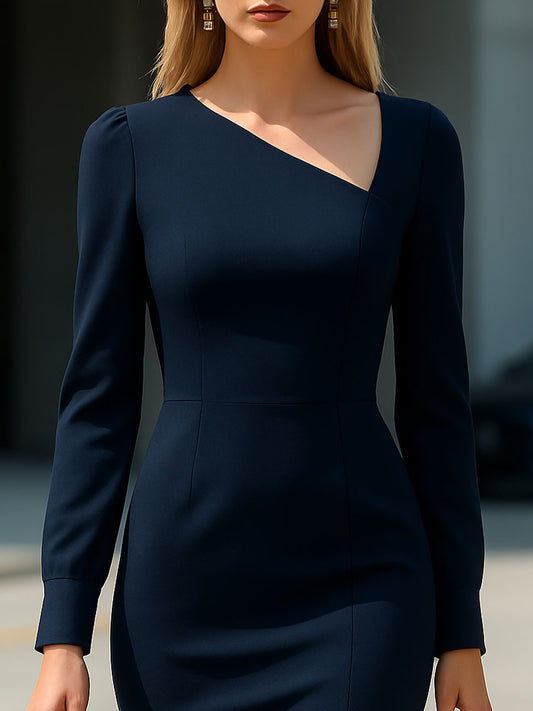Elegant Navy Asymmetric Neckline Sheath Dress