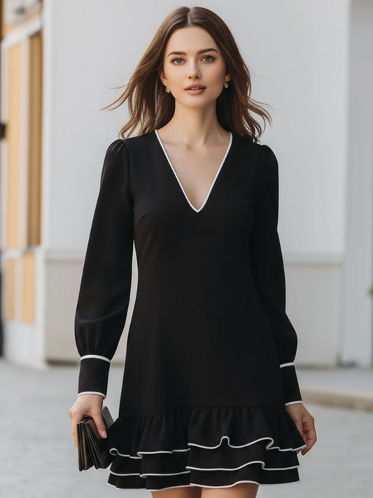 Black Contrast-Trim V-Neck Ruffle Dress: A Fusion Of Chic Minimalism And Playful Femininity