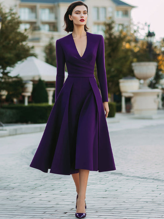 Elegant Deep V-Neck Structured A-Line Midi Dress
