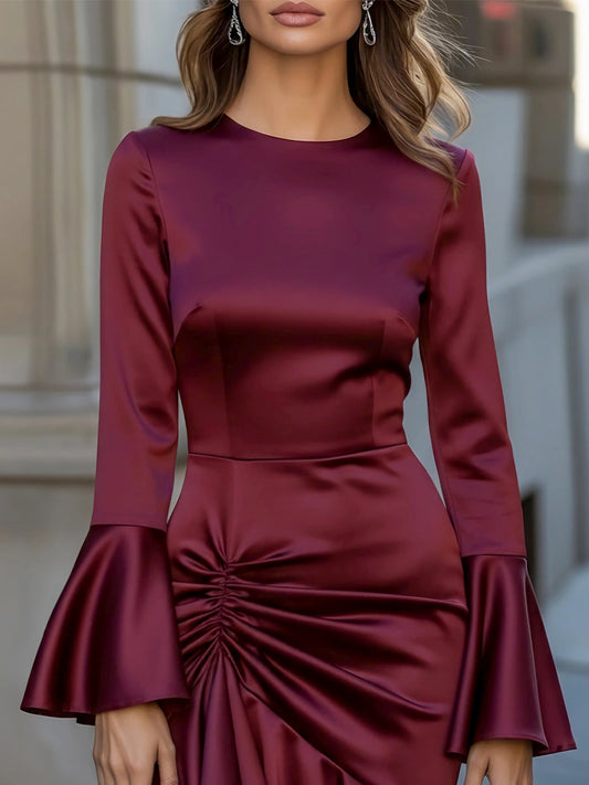 Red Round Neck Lantern Sleeve Long Sleeve Ruffle Satin Maxi Dresses