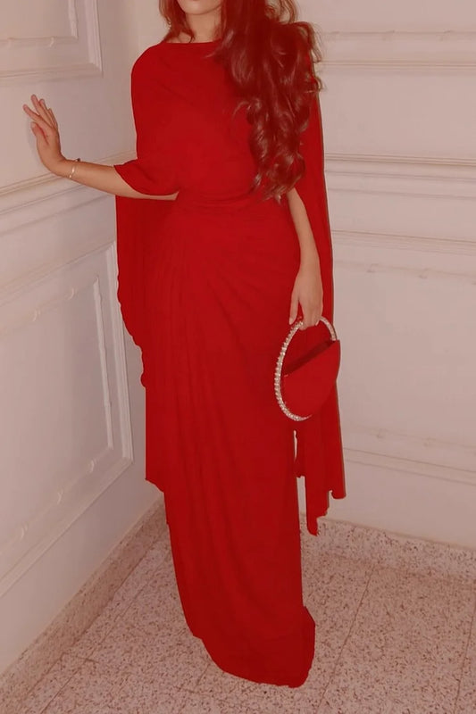 Asymmetric Cape Sleeve Ruched Waist Pleated Boat Neck Maxi Dresses