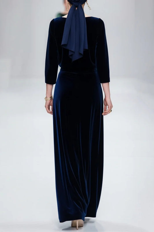 Mooyius Midnight Blue Velvet Draped Wrap Midi Dress