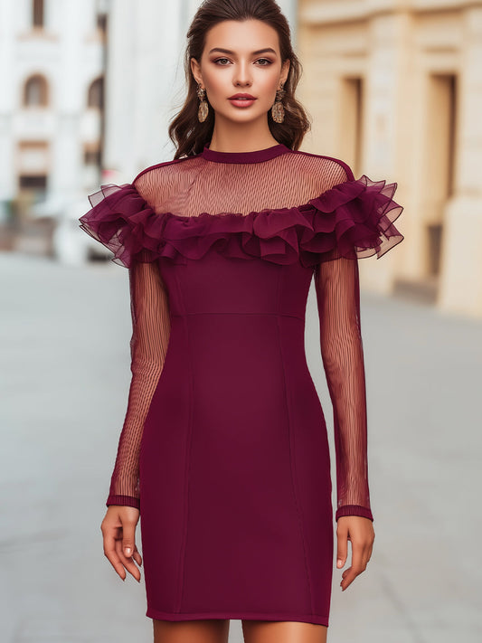 Elegant Sheer Mesh Lantern-Sleeve Bodycon Mini Dress