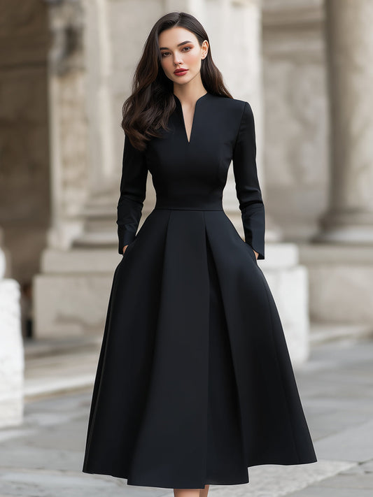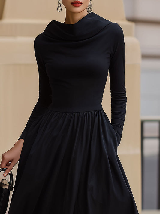 Sleek Black Cowl-Neck Long-Sleeve Midi Dress