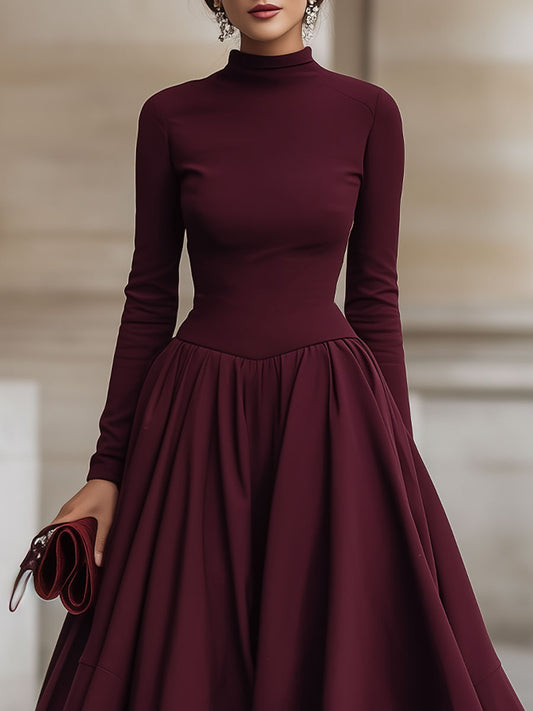 Burgundy High-Neck Long-Sleeve High-Low Midi Dress