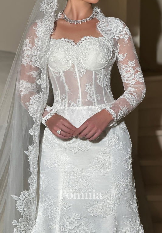 Long Sleeves Off-Shoulder Sweetheart Corset Tulle Lace Wedding Dress