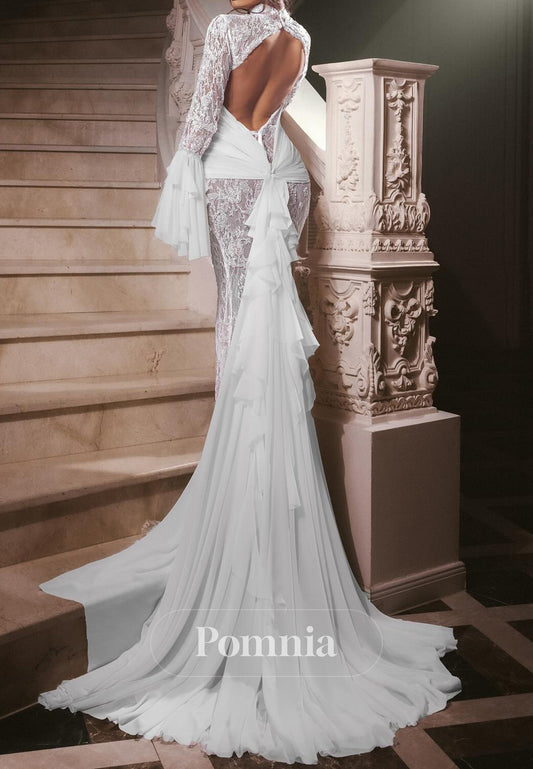 Elegant High Neck Long Sleeves Ruched Mermaid Wedding Dress