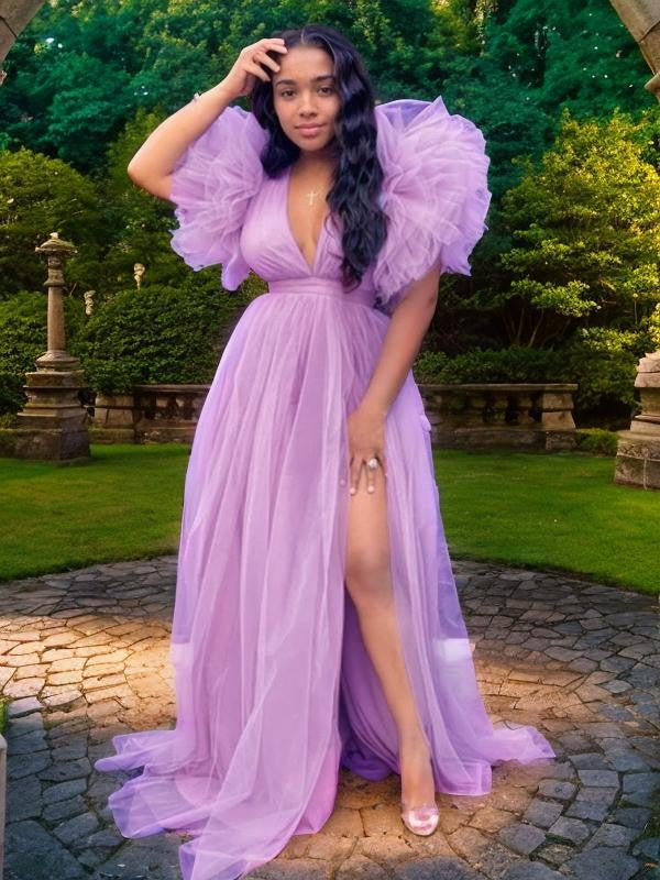 Elevate your formal wardrobe with this sophisticated A-line silhouette, expertly crafted to flatter and inspire confidence. The voluminous tulle construction creates dramatic movement, while delicate ruffled layers add dimensional texture and visual interest. A refined V-neckline offers an elegant frame, and the sleeveless design ensures versatility for any season. The sweeping brush train provides a graceful finishing touch, making this piece ideal for weddings, galas, and milestone celebrations. Constructed with premium materials and meticulous attention to detail, this dress combines timeless elegance with contemporary style.