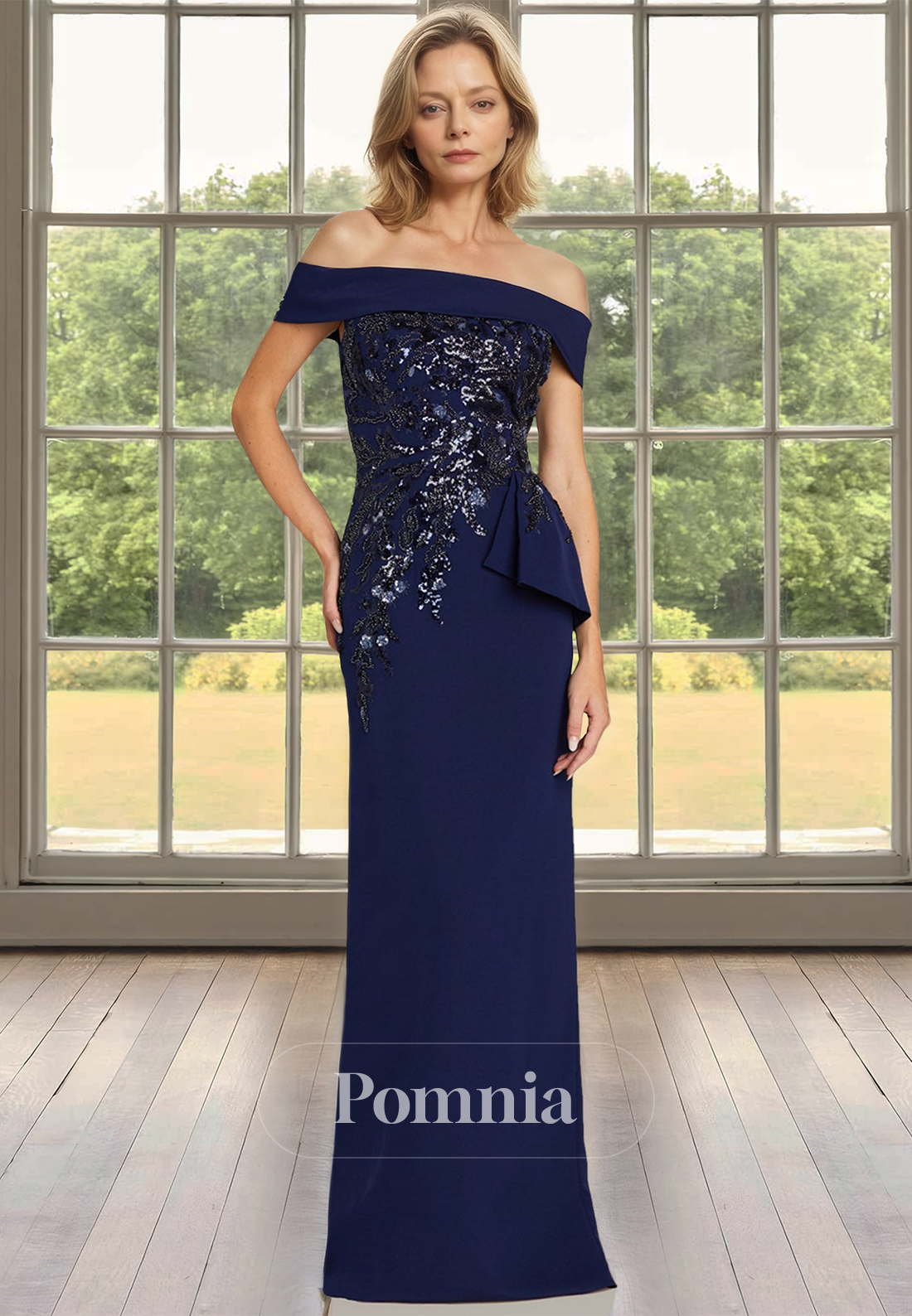 This dark navy off-shoulder dress is perfect for a mother of the bride. Designed with cap sleeves and stunning appliques, it is made of high-quality satin and falls elegantly to the floor. Stay stylish and comfortable all night long with this timeless and sophisticated piece.