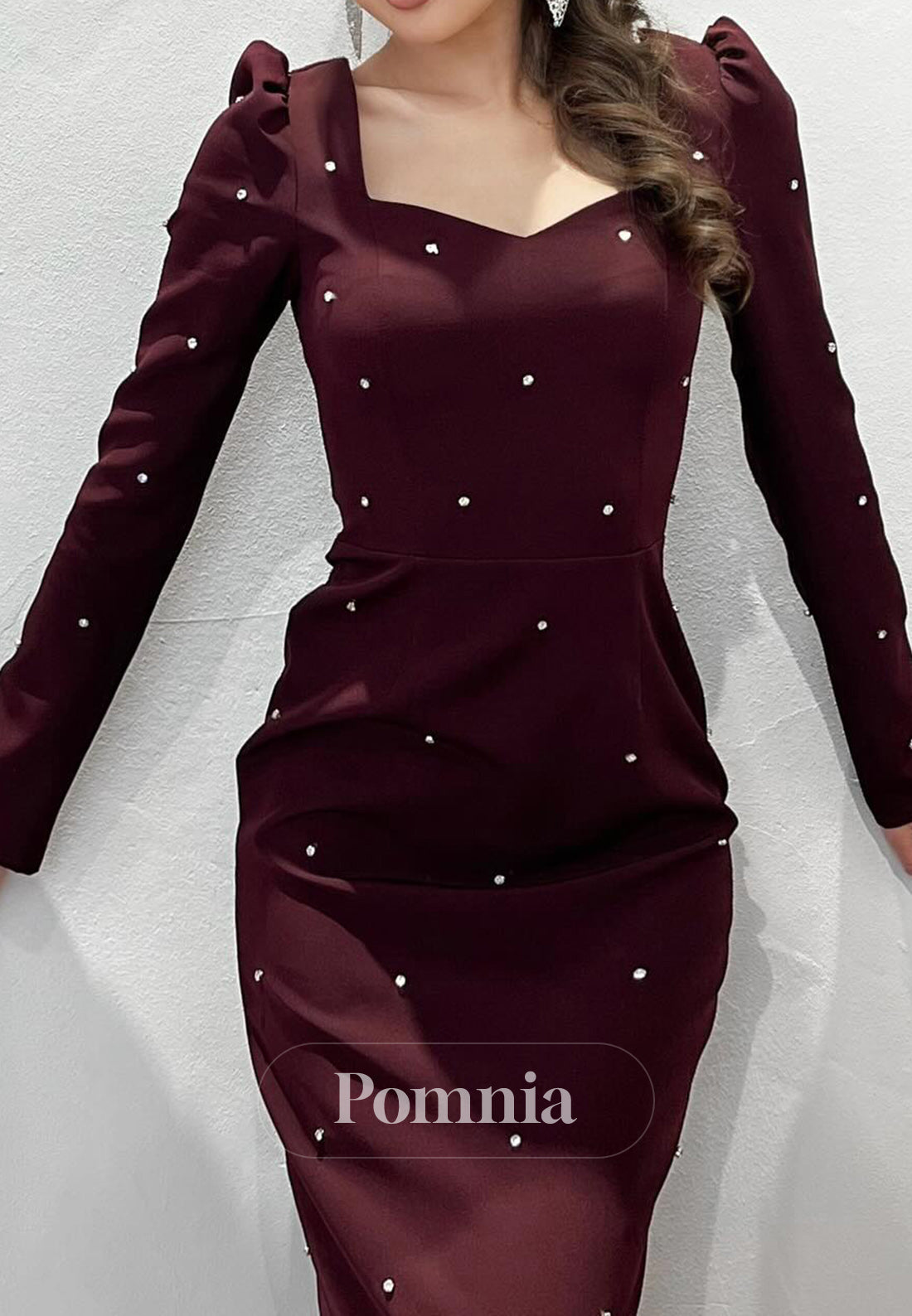 Elevate your evening attire with this sophisticated knee-length cocktail dress. Featuring elegant long sleeves and a flattering sweetheart neckline, the dress is adorned with delicate pearl embellishments that catch the light with every movement. The knee-length cut offers versatility for various formal occasions while maintaining a refined silhouette.