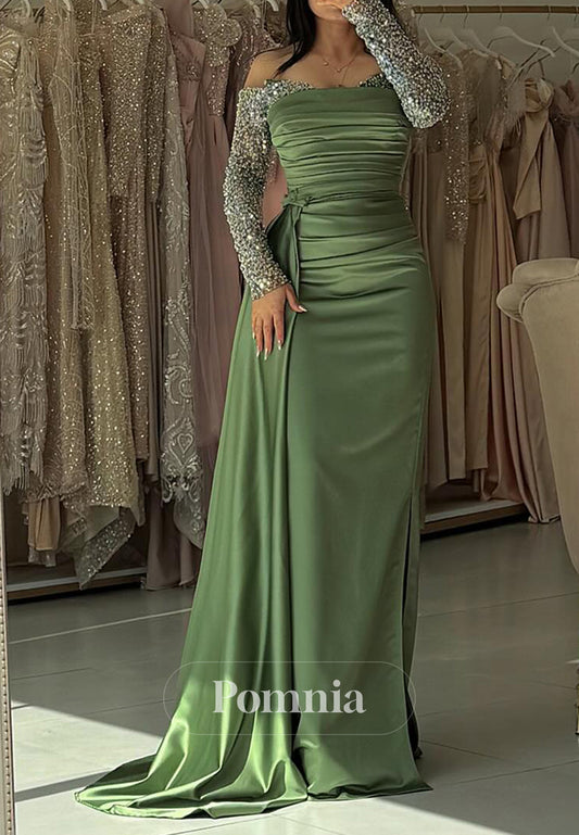 P1988 - Off Shoulder Beaded Long Sleeves Pleated Side Slit Long Evening Prom Dress