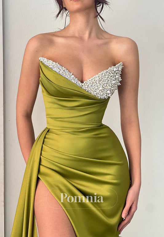 P1368 - A-Line Strapless V-Neck Beads Pleats Long Evening Formal Prom Dress with Slit