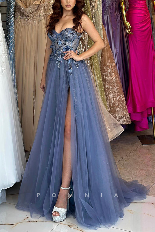 P1572 - A-Line Strapless Sweetheart Side Split Tulle Appliques Prom Formal Dress