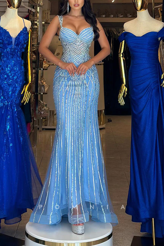 P1581 - Spaghetti Straps V-Neck Sequines Side Split Sleeveless Prom Evening Dress