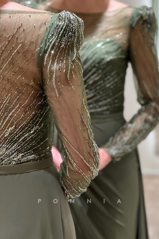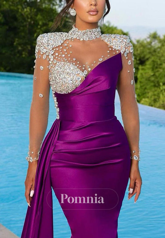 P2071 - Flattering Mermaid Beaded Pleated Long Sleeves Satin Long Prom Evening Dress