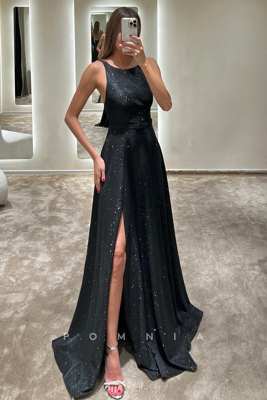 P1590 - Sparkly A-Line Scoop Side Split Belt Sleeveless Long Evening Formal Dress