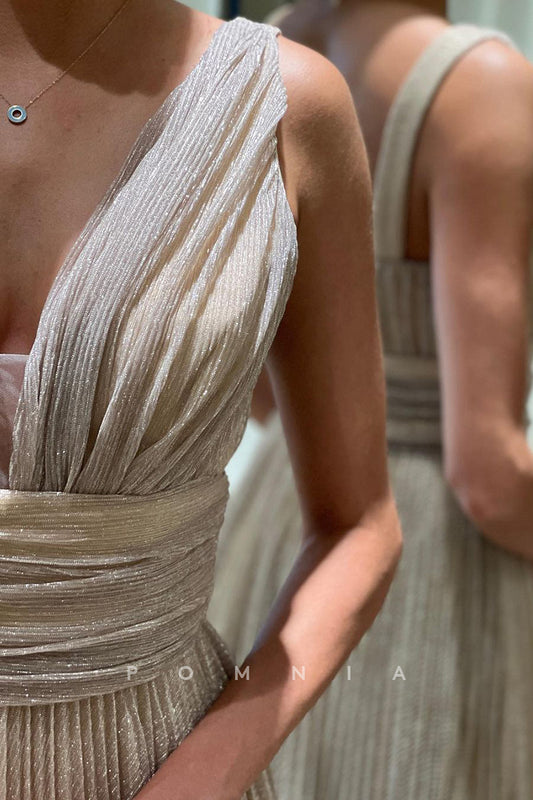 P1599 - A-Line Straps Deep V-Neck Ruched Sleevelss Long Evening Formal Dress