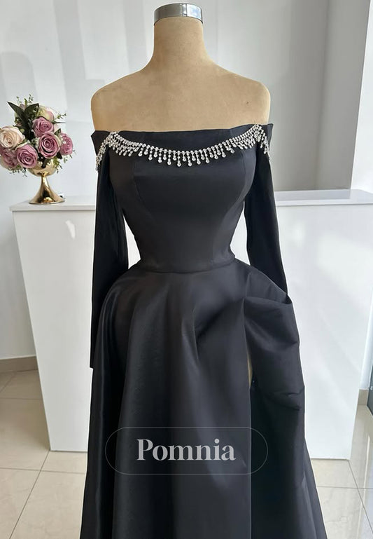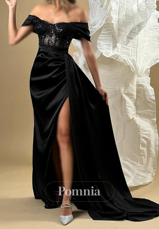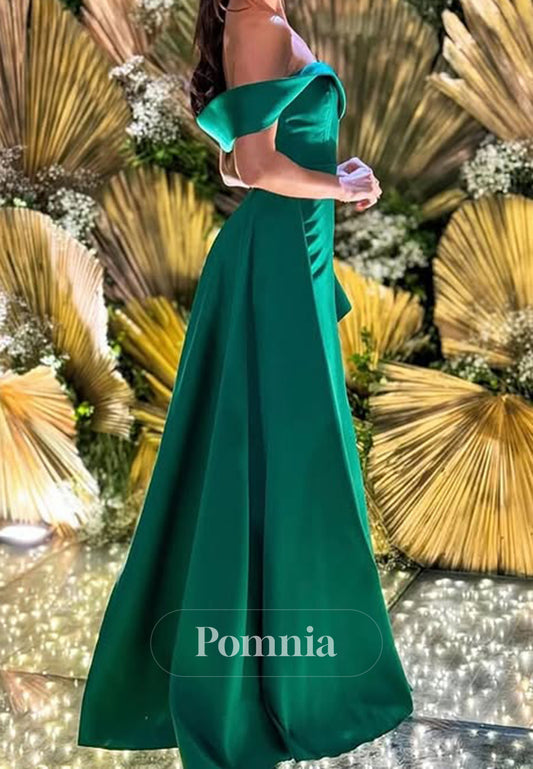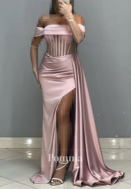 P1390 - Off-Shoulder Beads Pleats Side Slit Long Satin Prom Evening Formal Dress