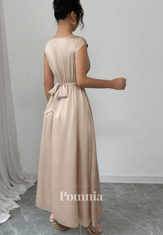P1591 - A-Line Strapless Pleats Cap Sleeves Side Split Satin Prom Evening Formal Dress