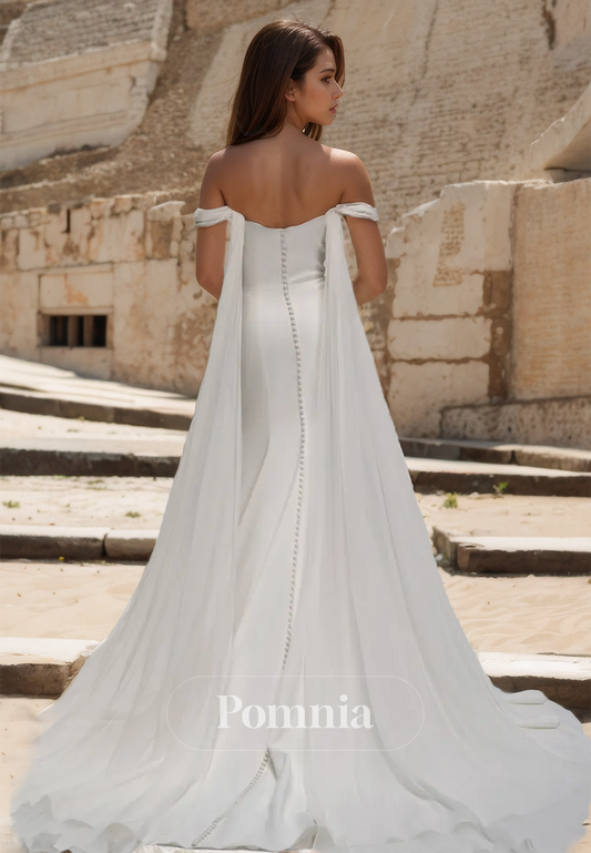 Simple Off-Shoulder Side Slit Sweep Train Mermaid Satin Wedding Dress