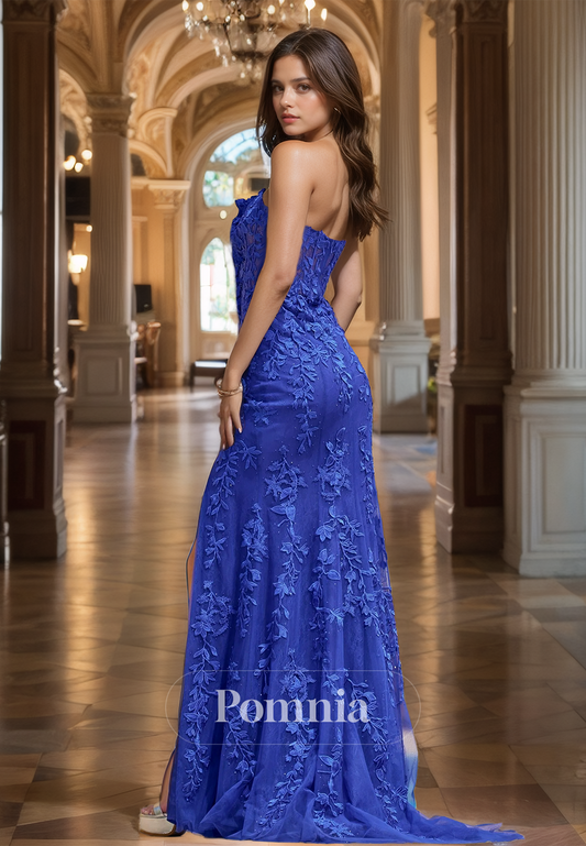 Royal Blue Strapless Sleeveless Prom Dress with Slit Corset Tulle Evening Party Dress