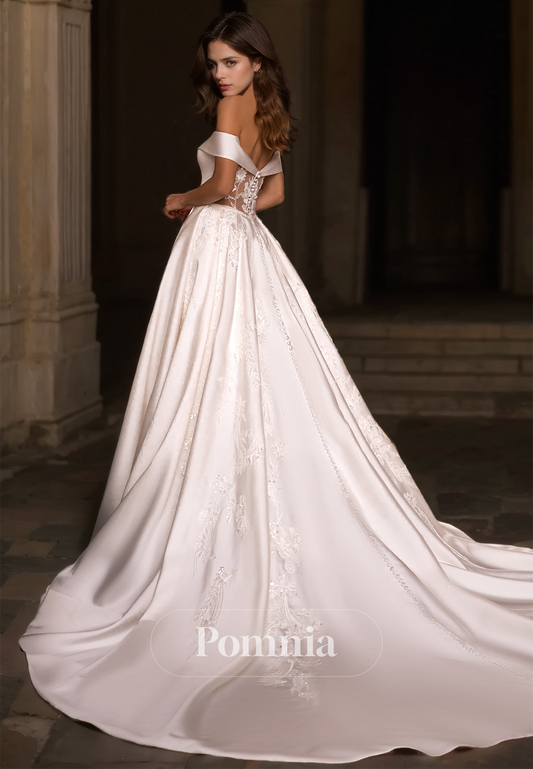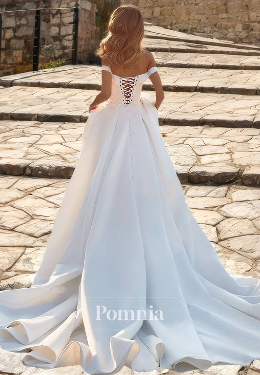 A-Line Off-Shoulder Sequins Side Slit Court Train Satin Wedding Dress