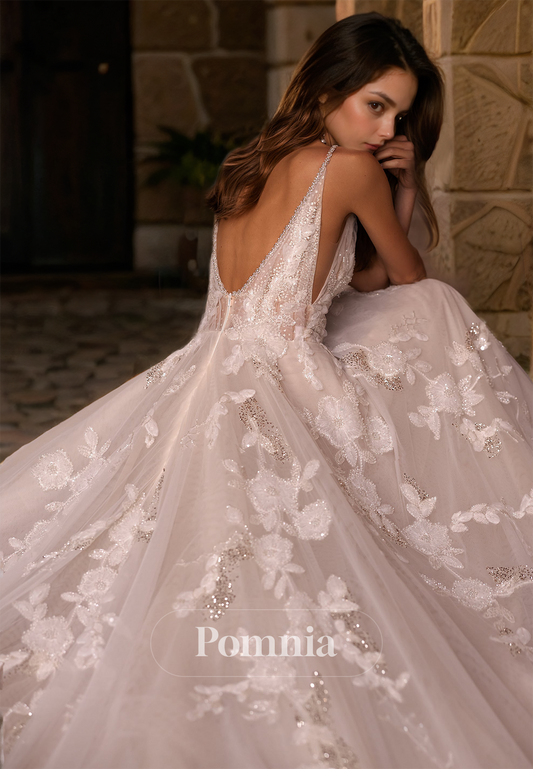 Deep V-Neck A-Line Spaghetti Straps Backless Appliques Lace Wedding Dress
